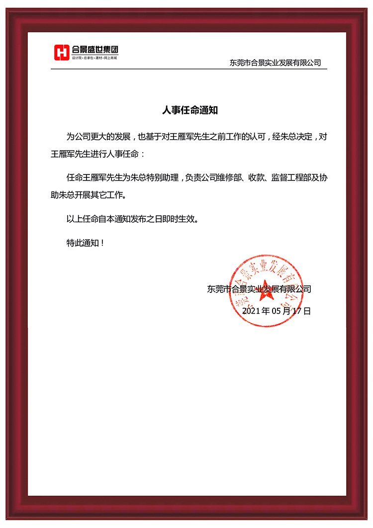 為推動(dòng)公司更大發(fā)展,經(jīng)公司綜合評估,王雁軍先生將擔(dān)任朱總特別助理,負(fù)責(zé)公司維修部、收款、監(jiān)理部及協(xié)助總經(jīng)理開展其他工作。